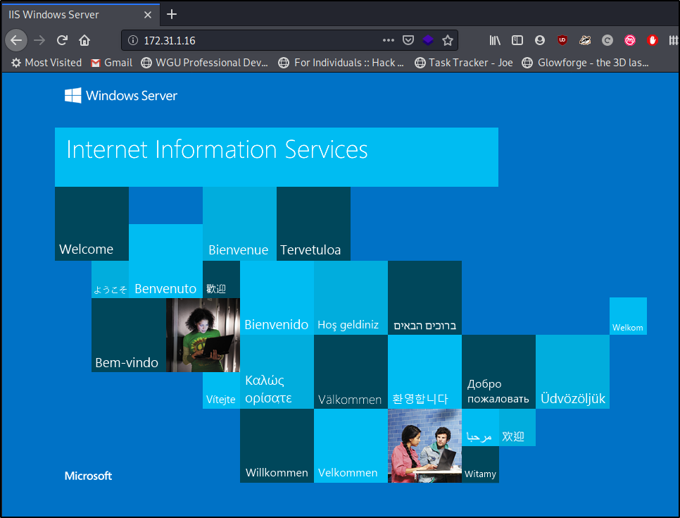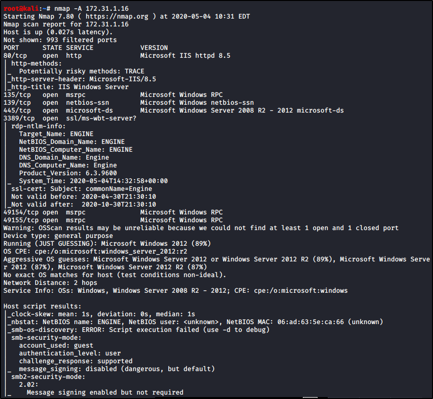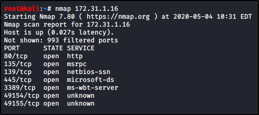 kali@kali:~/cyberseclabs$ nmap 172.31.1.19 Starting Nmap 7.80 ( https://nmap.org ) at 2020-06-25 10:33 EDT Nmap scan report for 172.31.1.19 Host is up (0.10s latency). Not shown: 990 closed ports PORT STATE SERVICE 135/tcp open msrpc 139/tcp open netbios-ssn 445/tcp open microsoft-ds 3389/tcp open ms-wbt-server 8080/tcp open http-proxy 49152/tcp open unknown 49153/tcp open unknown 49154/tcp open unknown 49155/tcp open unknown 49163/tcp open unknown Nmap done: 1 IP address (1 host up) scanned in 20.86 seconds