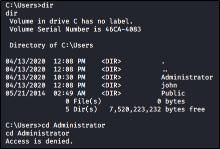 C:\Users\ben\Desktop>whoami /priv whoami /priv PRIVILEGES INFORMATION ---------------------- Privilege Name Description State ============================= ========================================= ======== SeChangeNotifyPrivilege Bypass traverse checking Enabled SeImpersonatePrivilege Impersonate a client after authentication Enabled SeCreateGlobalPrivilege Create global objects Enabled SeIncreaseWorkingSetPrivilege Increase a process working set Disabled C:\Users\ben\Desktop>