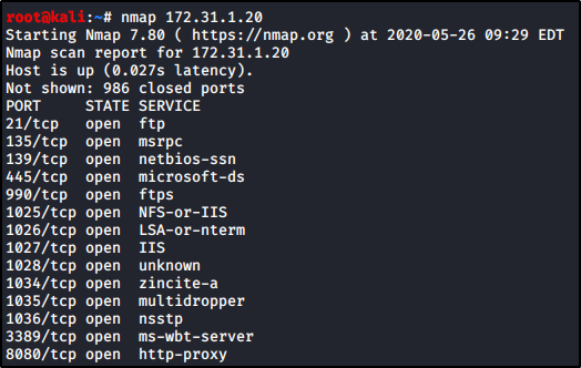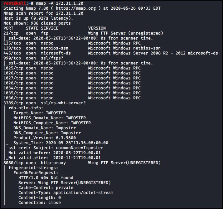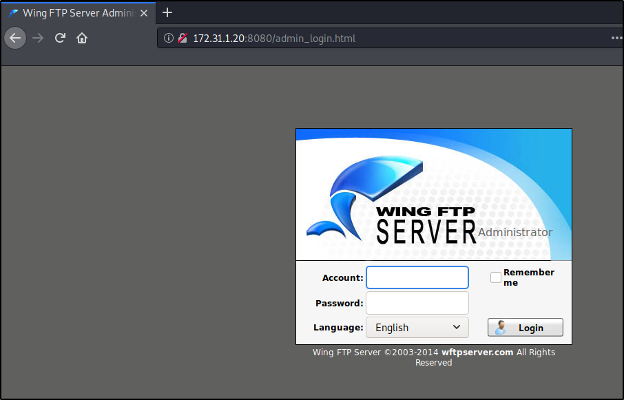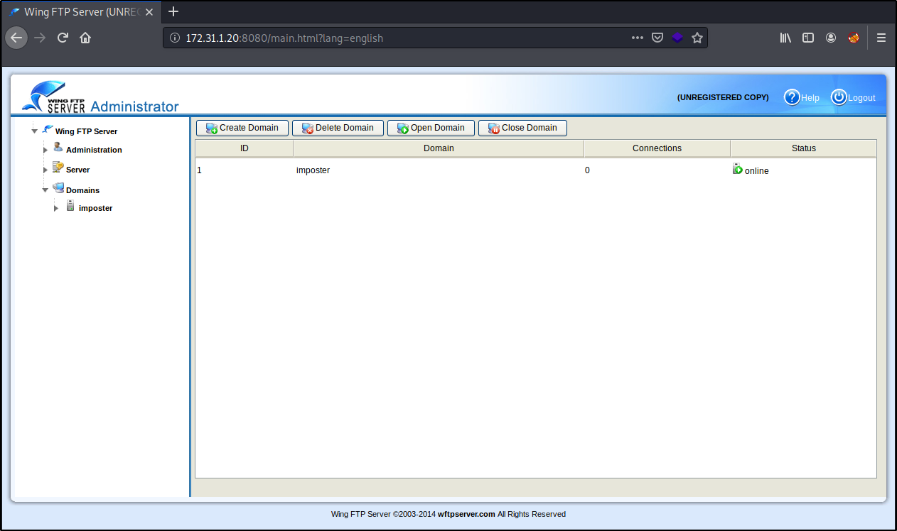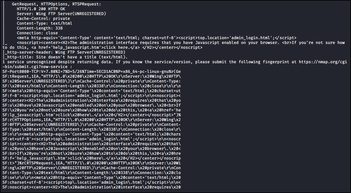 We have several ports open, however the important ones to notice here are ports 21 and 8080. 21 is running FTP, and port 8080 is running WingFTP, which is a graphical FTP manager.