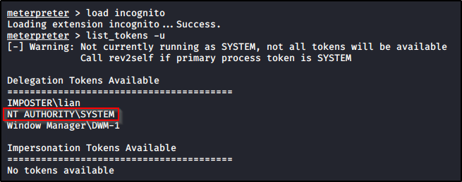 Notice that we can Delegate and Impersonate privileges. In order to do this, we can utilize the Incognito module in Meterpreter.
