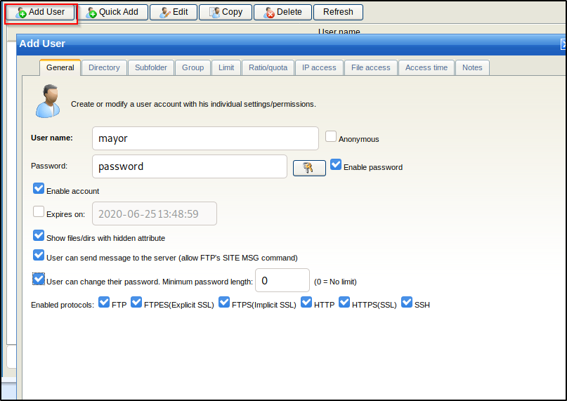 Quickly poking around reveals that we are an administrative user, and are able to create an FTP user, which there currently aren’t any.