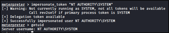 We notice that the NT AUTHORITY\SYSTEM token can be delegated, which we will use the impersonate_token command for.
