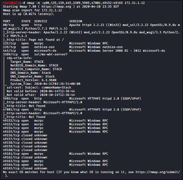 nmap -A -p80,135,139,445,3389,5985,47001,49152-49165 172.31.1.12